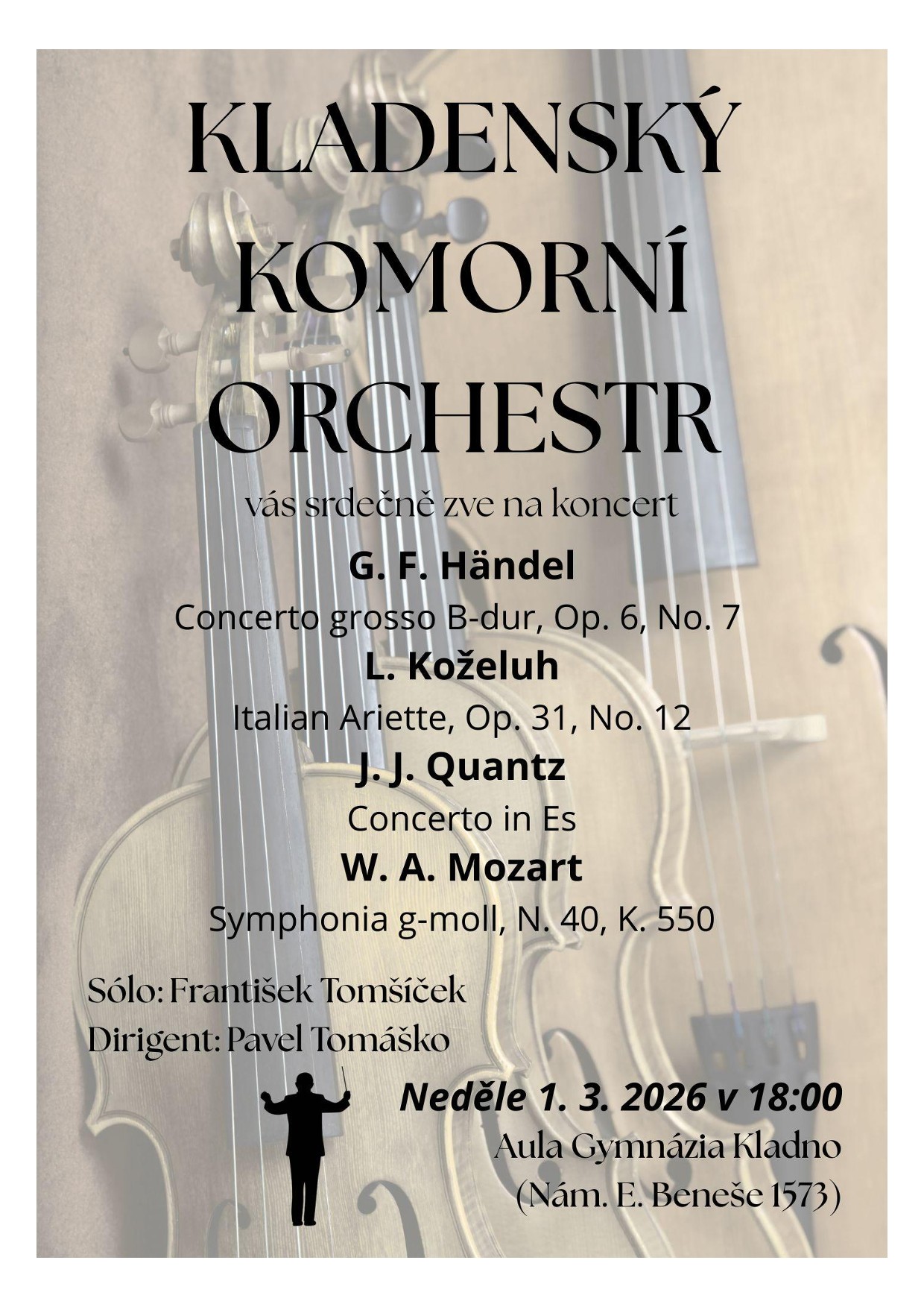 Program G. F. Händel, Concerto grosso B-dur, Op. 6, No. 7 Leopold Koželuh, Ariette XII Johan Joachim Quantz, Concerto in Es W. A. Mozart, Symfonie č. 40 g-moll